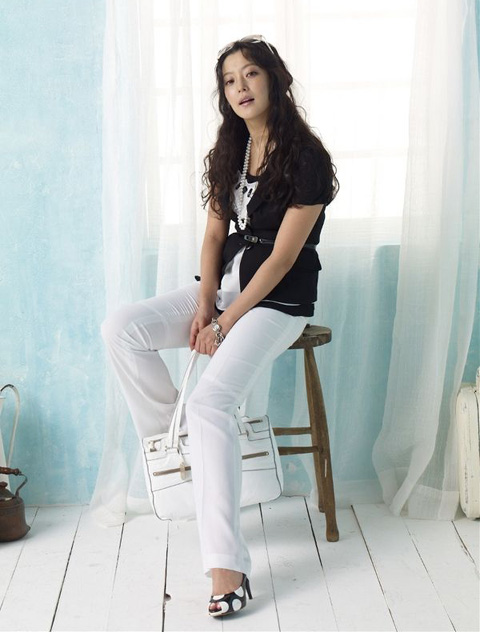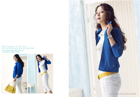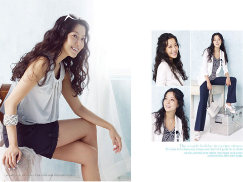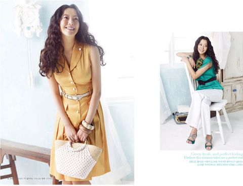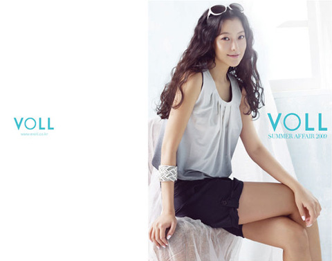 BST Summer 2009 của Voll phảng phất một mầu xanh tươi mát. Ta bắt gặp mầu xanh của bầu trời, của nước biển... trong những chiếc váy liền thân, trong chiếc khăn quàng cổ, chiếc mũ rộng vành chỉ dành cho mùa hè... hoặc điểm xuyết trong chiếc vòng tay ấn tượng. Kim Hee Sun vẫn rất phù hợp với những trang phục nhã nhặn, sang trọng mà đơn giản của VOLL.